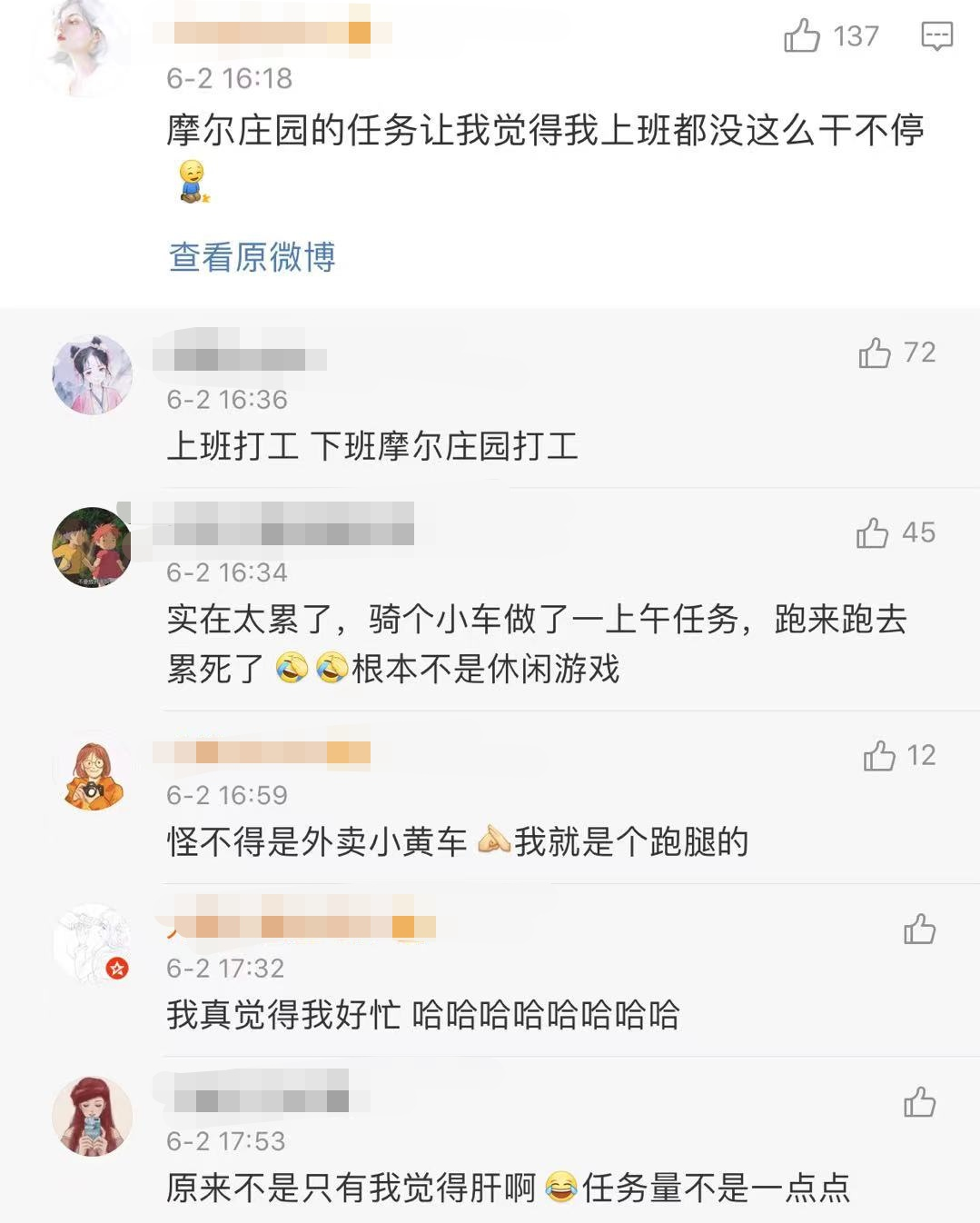 不过由于《摩尔庄园》的新手任务太长,得骑着摩托车到处送任务道具,以至于有人觉得自己在游戏里送外卖,“白天在公司搬砖,晚上在摩尔庄园打工”是摩尔们最近几天的真实写照。