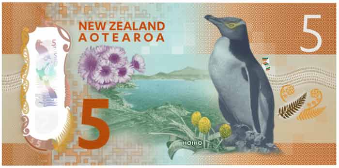 新西兰储备银行去年10月发行了新的5元和10元纸币,这也是该国“鲜亮纸币”(Brighter Money)计划的一部分。新版5元纸币的一面印着登山家埃蒙德·希拉里(Edmund Percival Hillary)面朝南岛库克山,另一面则是罕见的黄瞳企鹅和本地花卉。