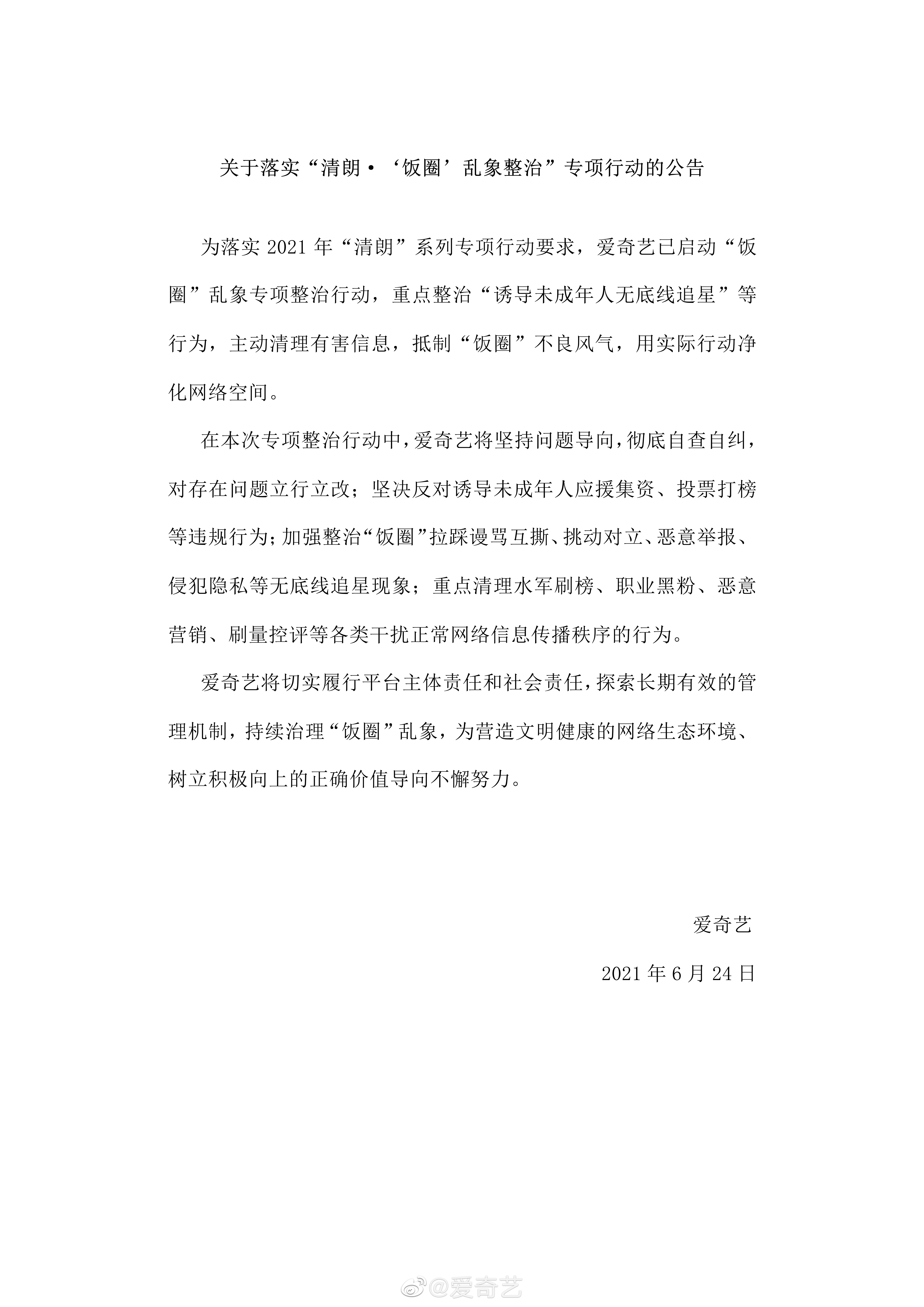 6月24日,@爱奇艺 微博发布公告称,为落实2021年“清朗”系列专项行动要求,爱奇艺已启动“饭圈”乱象专项整治行动,重点整治“诱导未成年人无底线追星”等行为,主动清理有害信息,抵制“饭圈”不良风气,用实际行动净化网络空间。