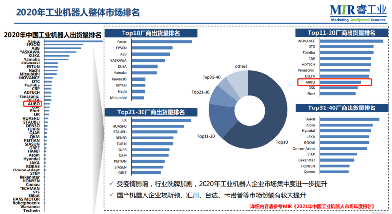 最新消息显示,睿工业(MIR)最新发布的《2021年中国工业机器人市场年度报告》表明,国产品牌中埃斯顿进前十,目前位列第八。