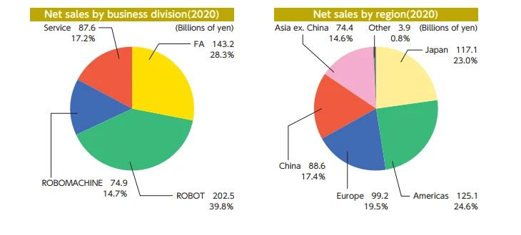而且从地区分布来看,2020年发那科在各个洲区的营收均发生不同程度的下滑,亚洲营收同比减少近6700百万日元,但发那科在其2020年财报中将中国的营收独立公布。