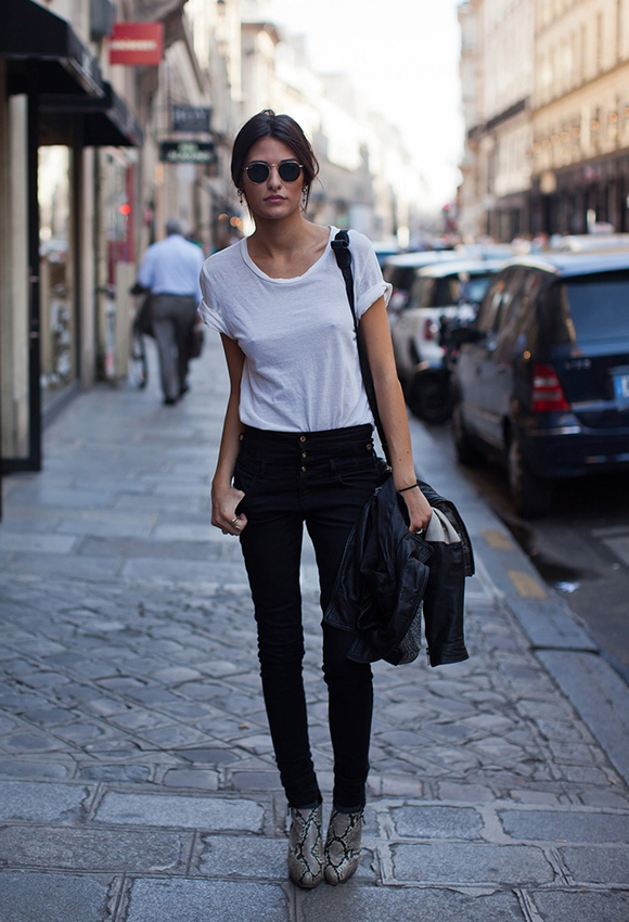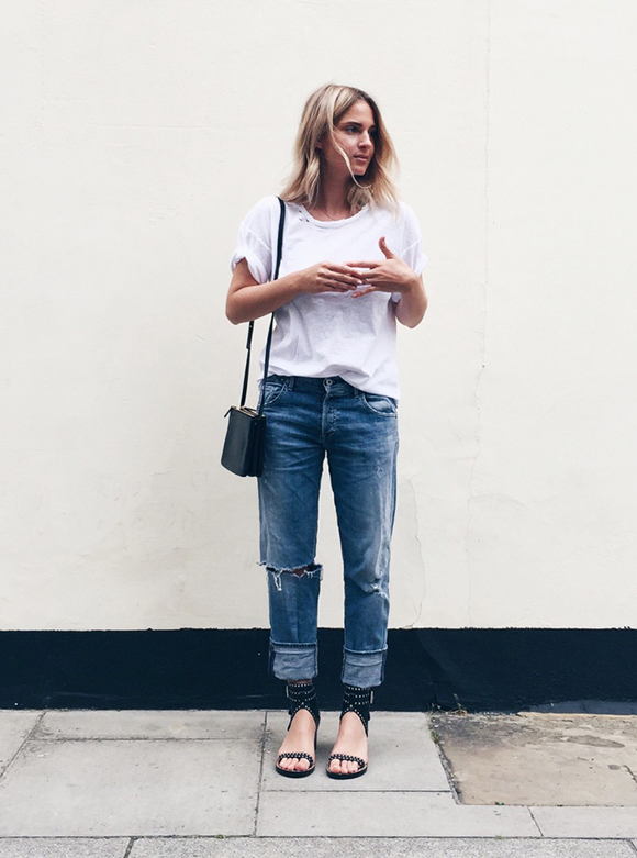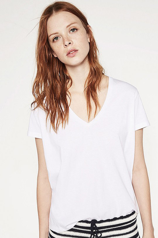 V领白tee在人们的想象中应该是百搭的,就像 Rosie 这样,有点去潮流化的裸靴也没有问题: