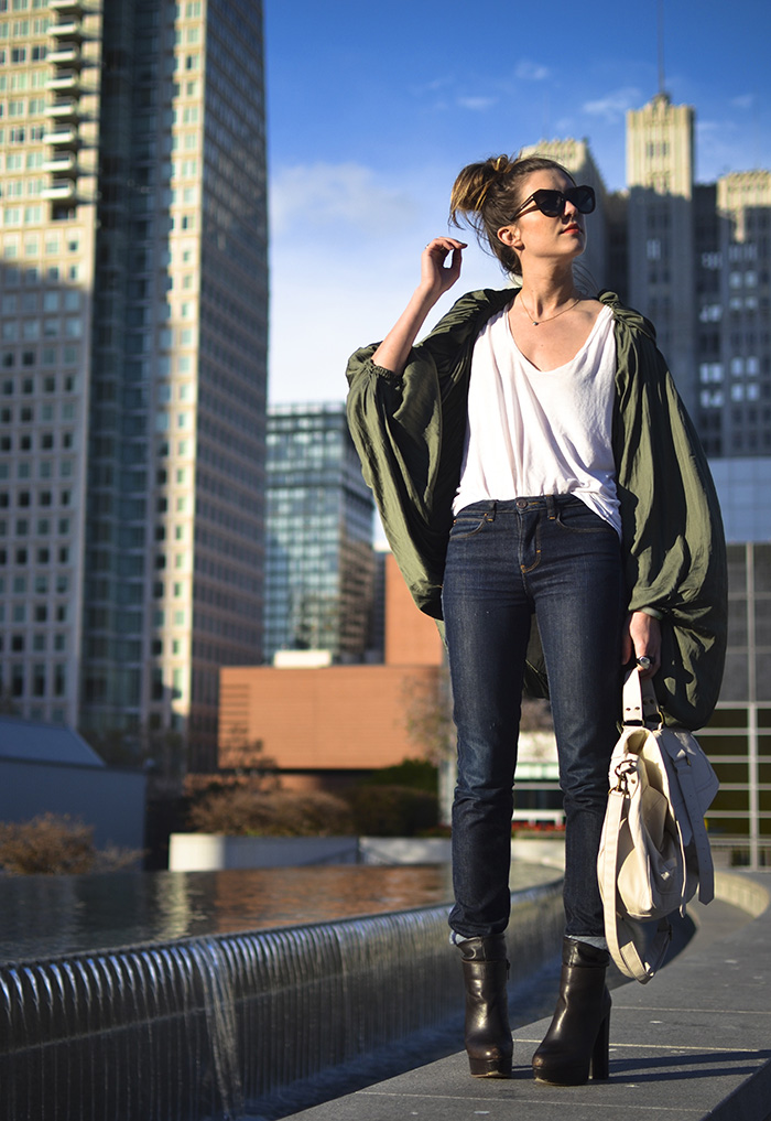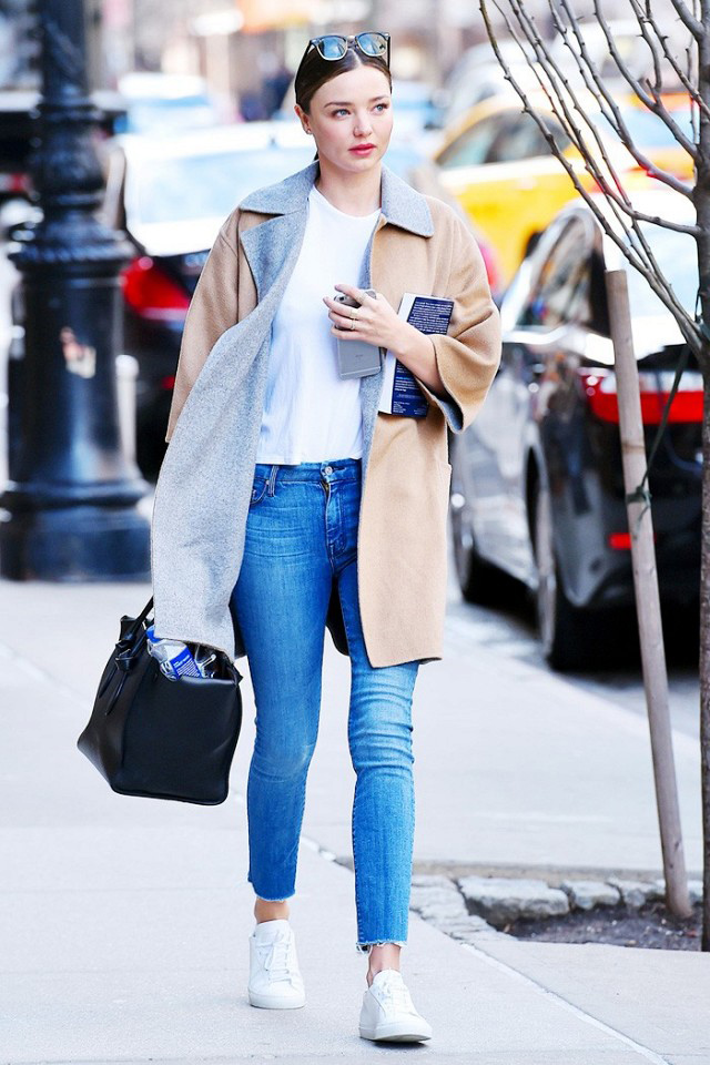 高领白tee配合风衣相当英气,但白色加卡其色有些平凡,于是破洞牛仔裤和拼色高跟鞋前来相助: