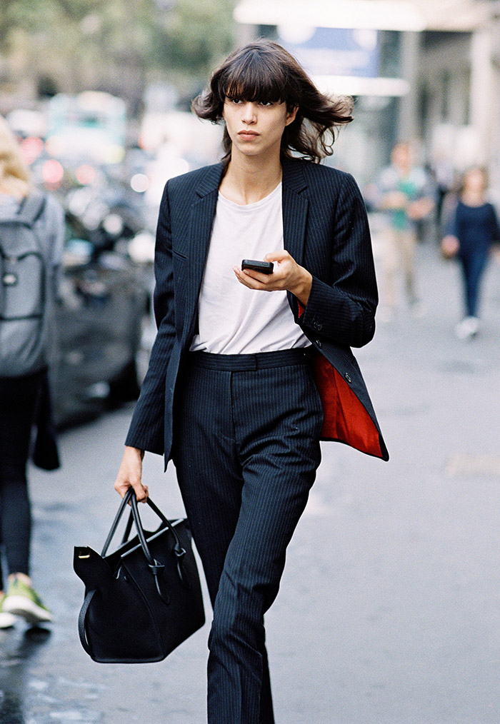 白tee的外搭很有学问,最标准的示范在这里,高圆领配干练西装: