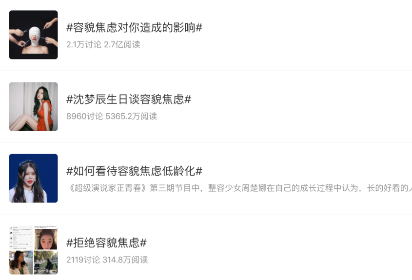 首先,第一个话题#容貌焦虑对你造成的影响#阅读量2.7亿,可见从大众角度来说,越来越多人都开始出现关于自己容貌、颜值的各种焦虑;