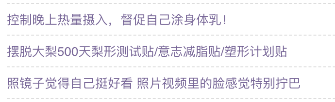 比如每晚节食的姑娘,要自我督促全身涂身体乳;一个100斤出头的女生,希望改变自己的梨形身材;一个照镜子觉得容貌形体各方面不错的女生,焦虑自己不上镜的问题。