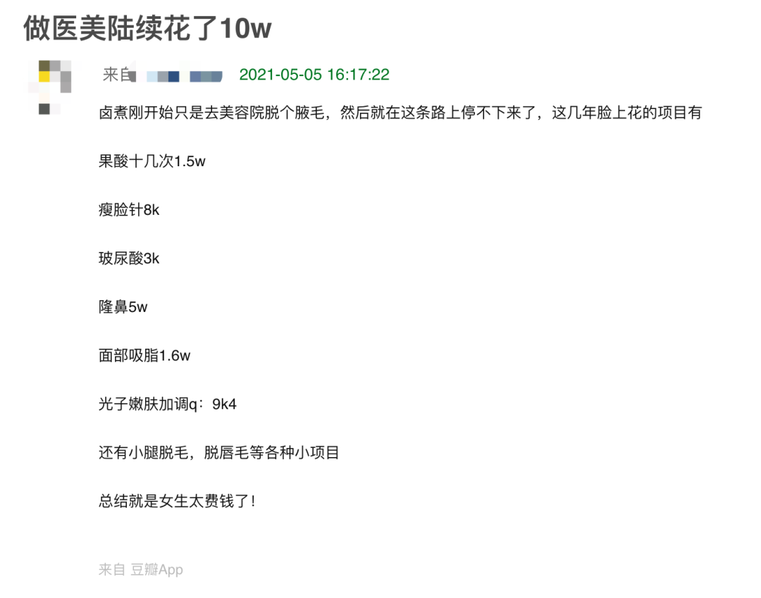 在#今天你精致了么#小组中,一个为解决容貌焦虑的用户,发布了一张医美消费清单,花费10万。而在下方的回复中,和她相似的消费人群比比皆是。这届年轻人为了解决容貌焦虑,消费可谓毫不手软。