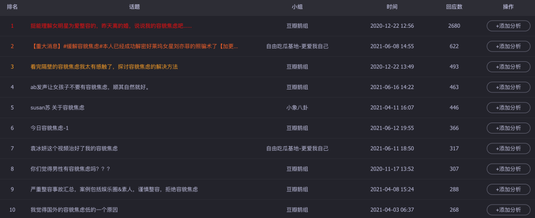 通过对抖音、豆瓣、微博相关热门话题的分析,洞察引擎发现,其实讨论量最高、点赞量最多的话题,往往和#拒绝容貌焦虑#相关。