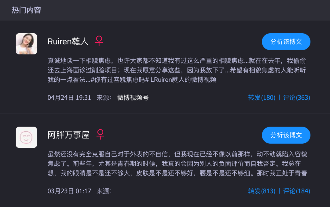 洞察引擎分析了微博、豆瓣近期的数据发现,提及Tag#容貌焦虑#的用户中,除了北京受到城市人口因素的影响而占据第一,但整体来看,北方女性的容貌焦虑较少,南方女性的焦虑较多。