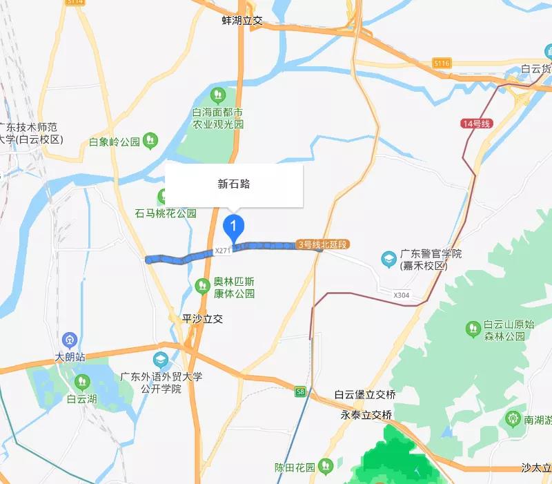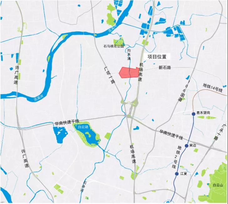 从图示位置可以看出,新石路两侧地块分布多条交通道路,从项目地块出发,可以较快接触到广花一路、机场高速、华南快速干线。