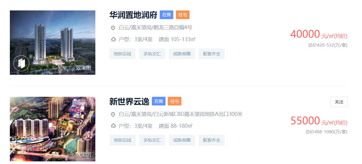 正因如此,龙归地铁站周边新盘、二手盘较少。靠近嘉禾望岗方向,新盘主要有华润置地·广州润府、新世界云逸在售,均价4万-5.5万元/㎡左右。