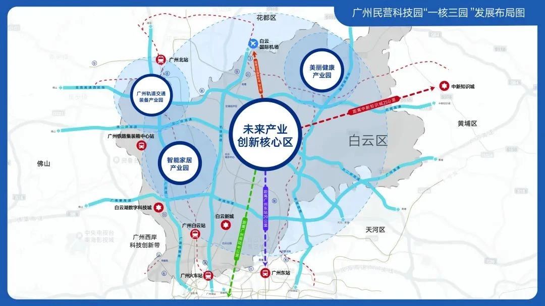 从发展布局图可以看到,这个未来产业创新核心区,辐射范围呈现圆形发散的形式。以白云为中心,向花都、黄埔、天河等多区域发散。其中,交通便利是其最能看到的优势,广州东站、广州北站、白云国际机场、广州火车站、广州白云站等这些大型交通枢纽与核心区都有紧密联系。