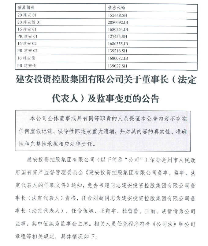 中国债券信息网消息,6月24日,建安投资控股集团有限公司发布公告称,依据亳州市人民政府国有资产监督管理委员会《建安投资控股集团有限公司董事、监事、法定代表人的任职文件》通知,免去韦翔同志建安投资控股集团有限公司董事长(法定代表人)资格,任命刘超同志为建安投资控股集团有限公司董事长(法定代表人),任命伍旭、王翔宇、杜蕾蕾、王丽、胡倩倩为公司监事,其中伍旭为监事会主席。