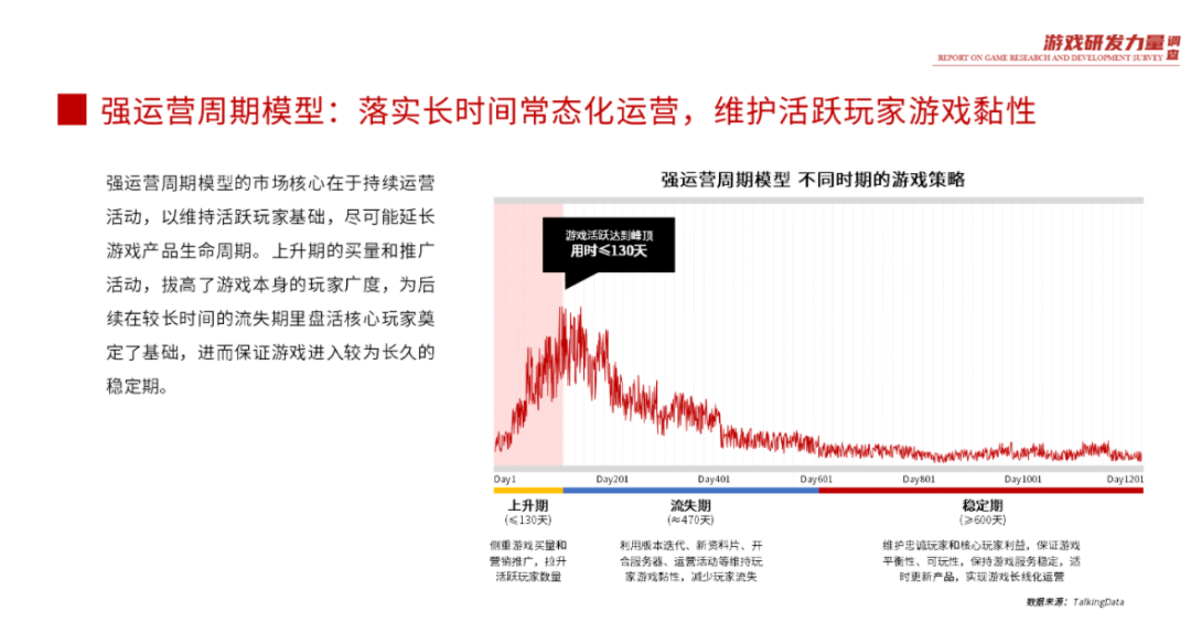 强运营式游戏通常会在130天前达到顶峰,随后步入约470天的流失期,与《江南百景图》的市场表现不谋而合:游戏上线60天后实现了畅销榜最好成绩,却在120天后出现明显下滑,并持续至今。