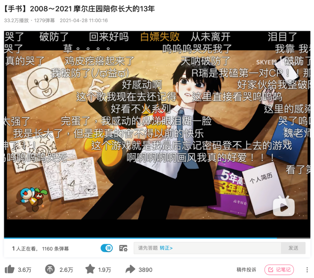 这种非常像“饭圈”的热搜运营方式,成功地进一步激发了用户和创作者们在微信、B站、抖音上的二次刷梗。例如在B站上,一支名为《摩尔庄园陪你长大的13年》的视频,把5年高考3年模拟也做成了“回忆杀”,让用户感慨“破防”。如此种种二次创作,也带动了游戏成功出圈。