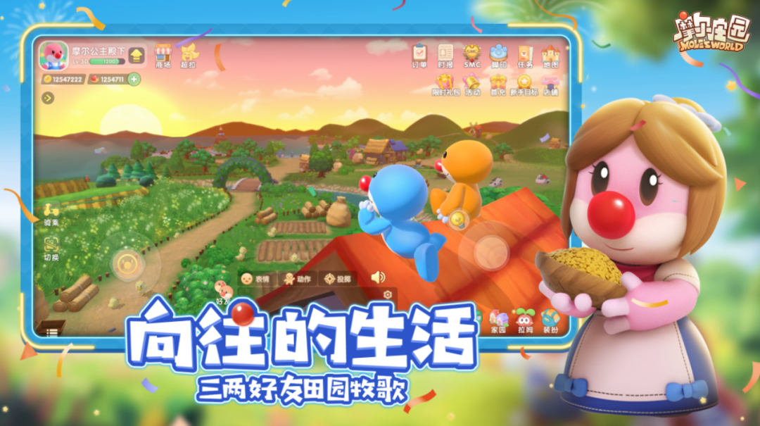 与此前的页游相比,《摩尔庄园》的手游精简了原本繁杂的社区模拟玩法,改为农场式的模拟经营玩法:种植,钓鱼,装扮家园,经营餐厅等等。随之而来的改变,是玩家在游戏内的驱动力:不再是传统游戏的“数值成长”、“段位提升”,而是社交分享。