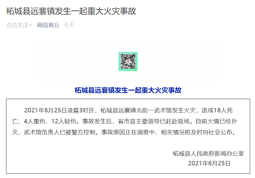 据“网信商丘”微信公众号消息,6月25日凌晨3时许,柘城县远襄镇北街一武术馆发生火灾,造成18人死亡、4人重伤、12人轻伤。事故发生后,省市县主要领导已赶赴现场。目前火情已经扑灭,武术馆负责人已被警方控制。事故原因正在调查中,相关情况将及时向社会公布。
