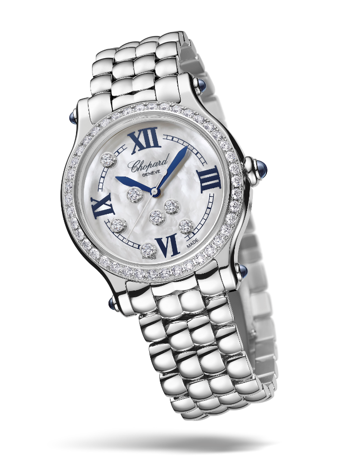 从美学角度而言,Happy Sport the First腕表在各方面都与1993年问世的原型表款相似。圆形表壳配以低调素雅的银色表盘,罗马时标点缀其间,其蓝色反光与表耳和表冠上镶嵌的五颗凸圆形蓝宝石遥相呼应。四排“鹅卵石”组成的链节表链如针织网眼般柔软,紧贴手腕曲线,令腕间散发柔美优雅的气韵。随着七颗灵动钻石在表盘的两层蓝宝石玻璃之间自由旋舞,这款具有复古外观的腕表体现了经典的运动时尚风格。