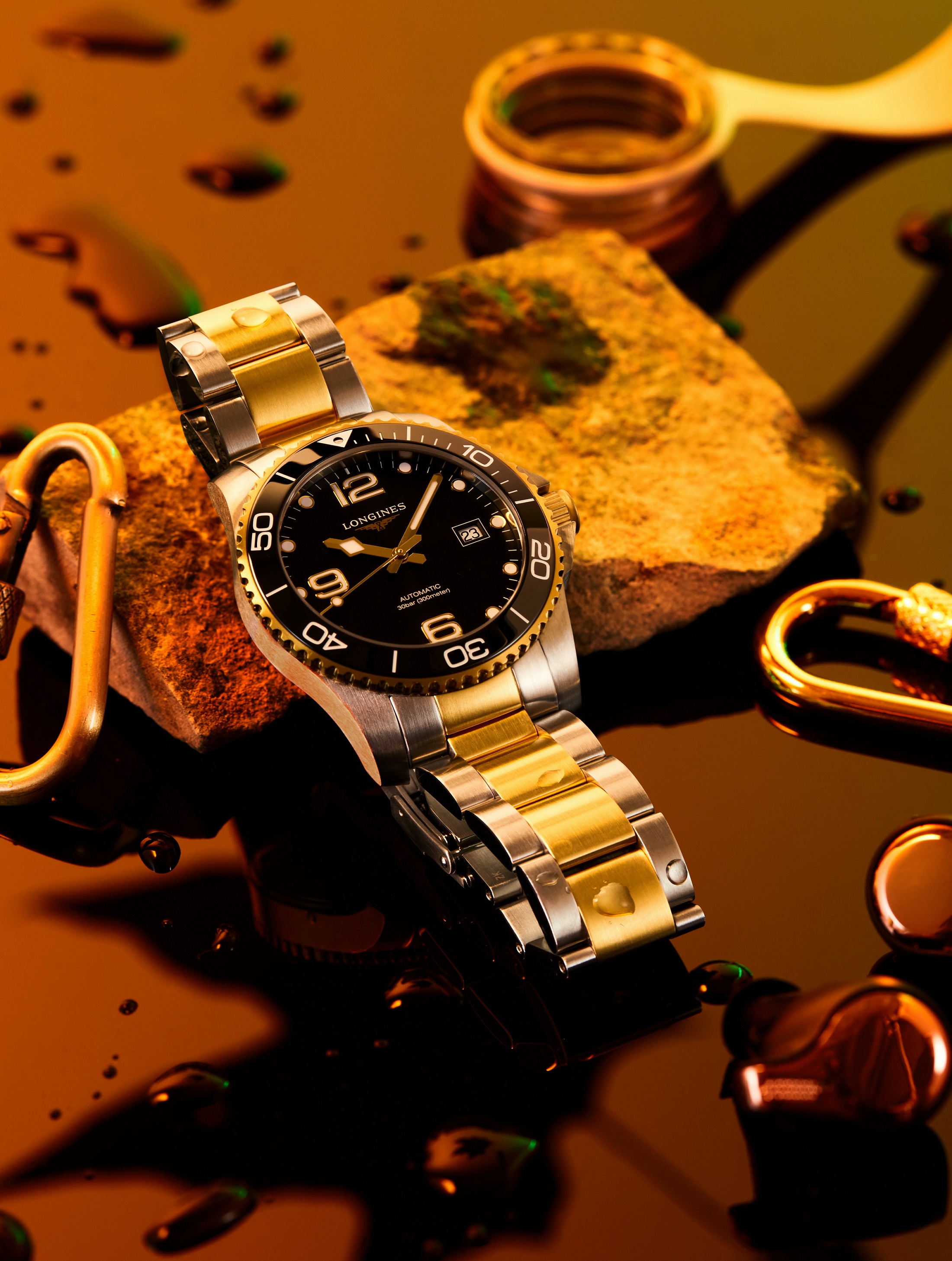 康卡斯潜水系列腕表L3.781.3.56.7,表链及表圈中融入黄色PVD材质,闪耀金与酷感黑的碰撞,彰显夏日优雅活力。表圈采用坚固耐磨的陶瓷材质,无需担忧户外运动时的摩擦磕碰。
