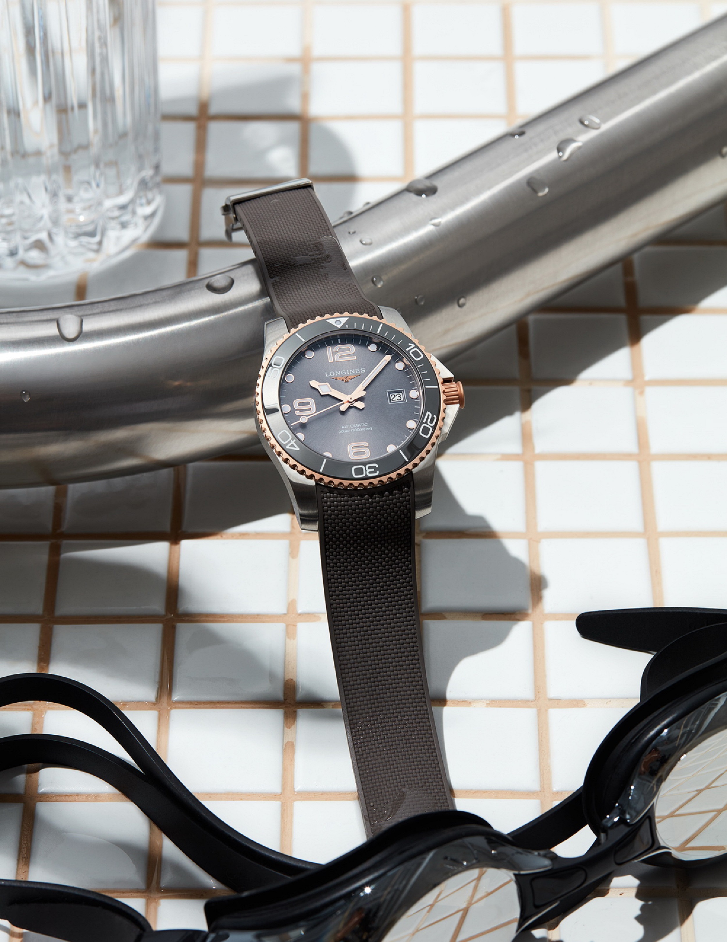 康卡斯潜水系列腕表L3.781.3.78.9从水上运动中汲取灵感,具有300米防水性能,满足水上运动的防水需求;灰色陶瓷材质表圈与玫瑰金PVD材质和谐相融,散发低调优雅气质,再搭配灰色橡胶表带,尽显运动风格。