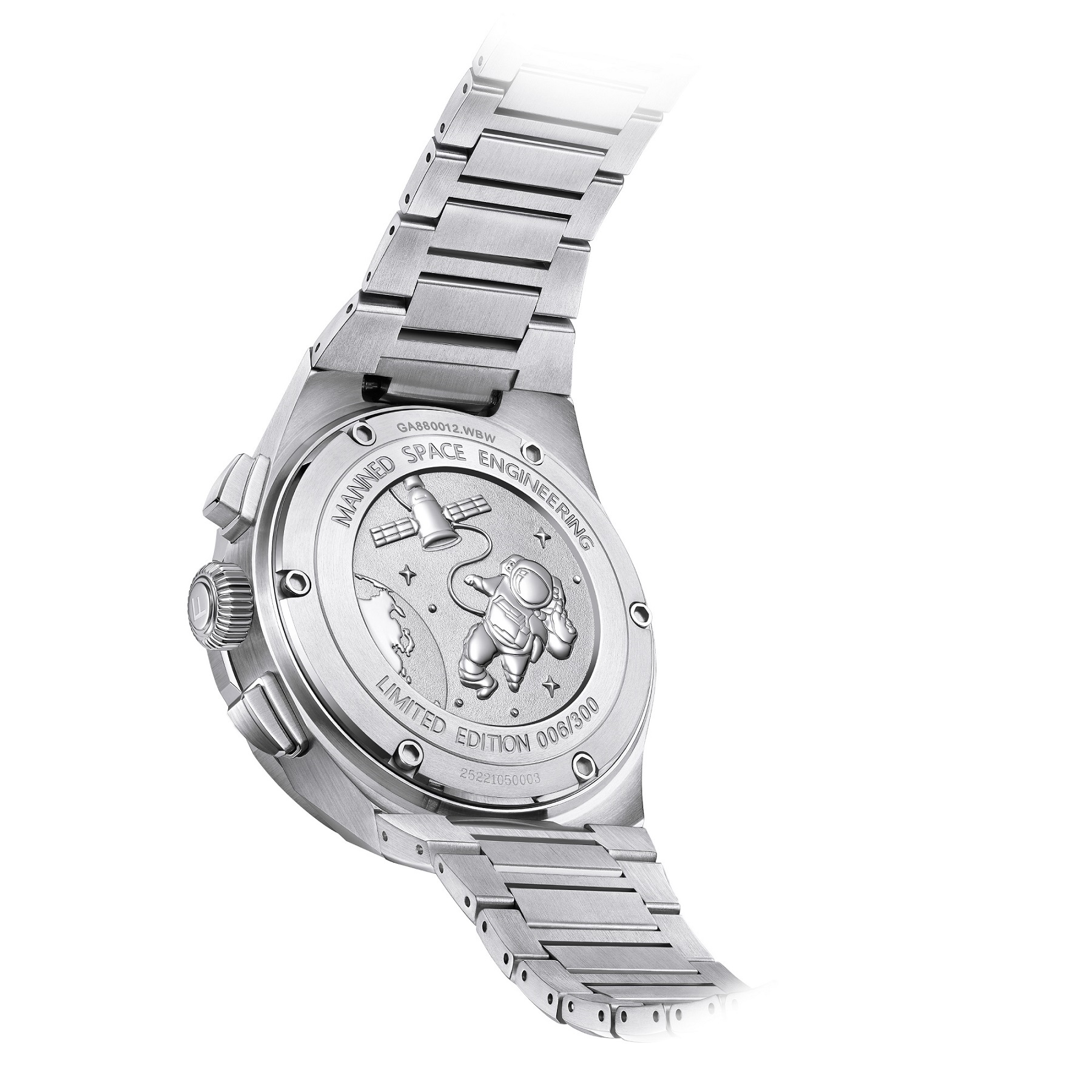 腕表底盖镌刻“太空漫步”图案,航天员背倚蔚蓝地球,迈向星辰大海,展望中国在太空探索领域的无限可能。随表附赠返回舱造型摆件及白色搭扣表带。表带复刻自舱外航天服表,将宽大表带以搭扣形式固定航天服外。这款腕表全球限量300枚,每一枚均镌刻独立编号。
