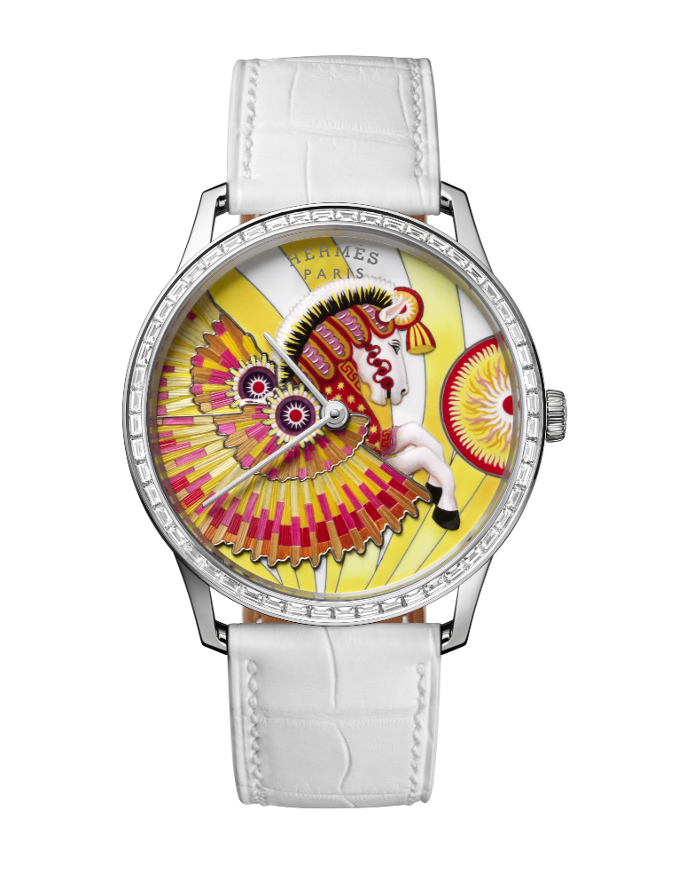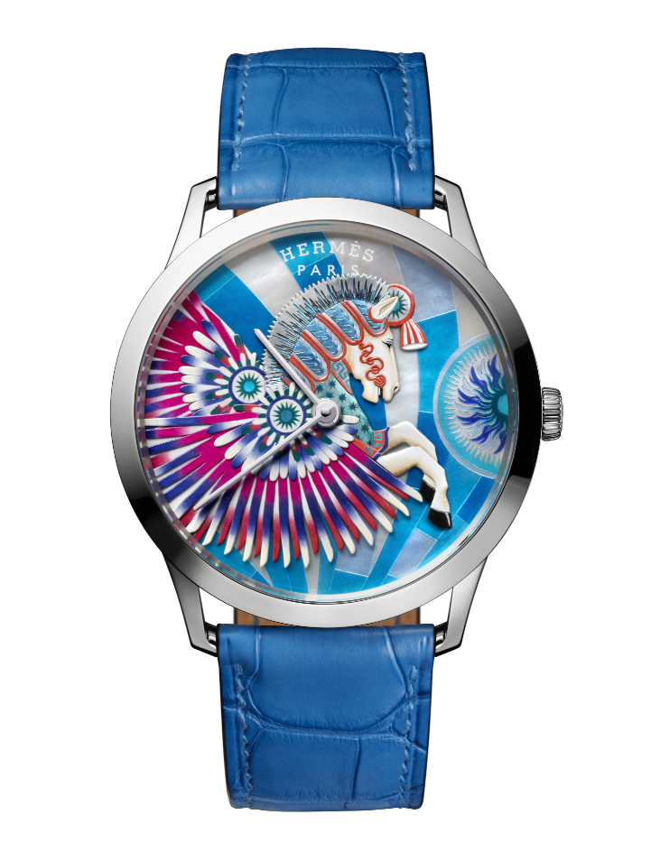 2015年面世的Slim d’Hermès腕表系列将爱马仕经典要素融于一身:简约风格、严谨态度与精美设计相互交织,和谐平衡。Slim d’Hermès La Source de Pégase腕表融合多种微型技法,在珐琅与雕刻工匠的精雕细琢下,呈现色彩斑斓的飞马造型。