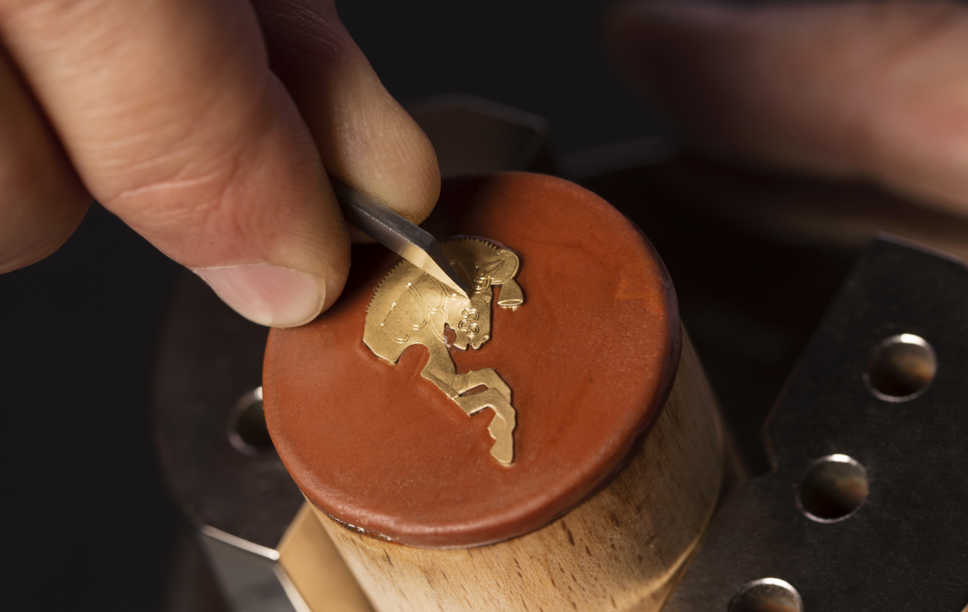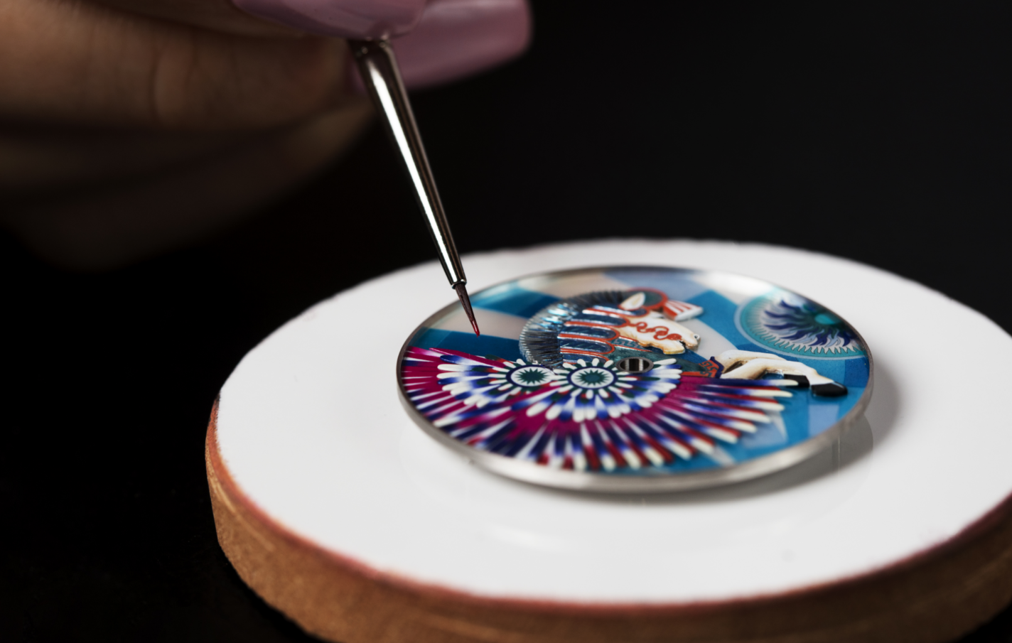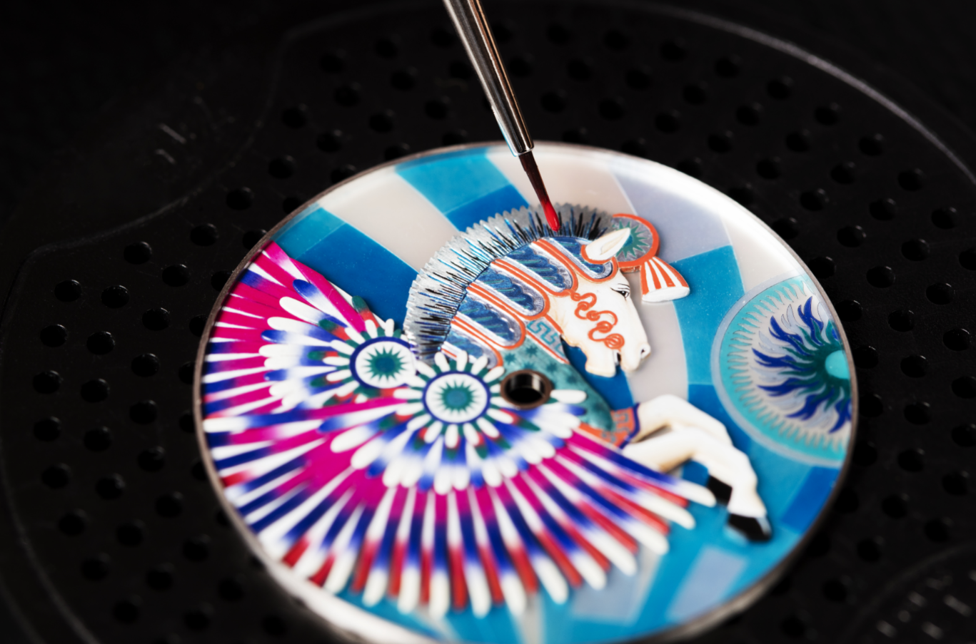 第二款采用同样靓丽的天蓝色调,为雕刻而成的飞马添上金丝织就的双翼,与彩绘珍珠母贝表盘相得益彰。工匠用画笔将五彩缤纷的颜料一丝不苟地描绘于表盘上。待颜料在窑炉中烘干后,便可由雕刻师悉心雕琢富有立体感的金马轮廓,再以手工细细描绘。最后,飞马的羽翼以珍贵的金线层层叠加勾勒而成,并涂上明艳色彩。