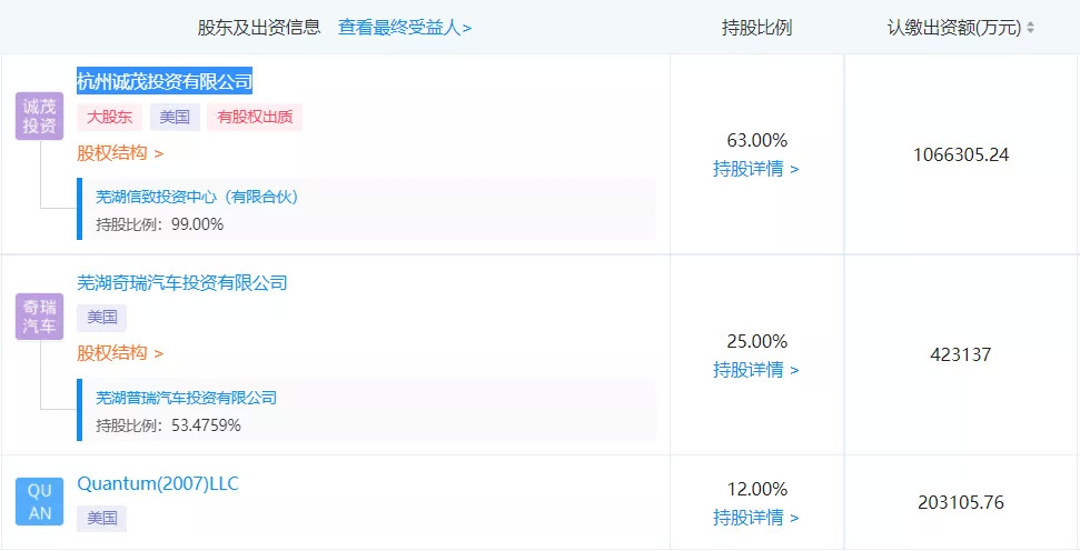 而随着2019年,宝能再以15.6亿人民币的价格继续从Quantum(2007)LLC手中收购了12%的股份,至此宝能彻底以63%的股权主导观致汽车。从企查查数据可以看到,目前观致汽车最大股东为杭州诚茂投资有限公司,而这家公司隶属于宝能集团。
