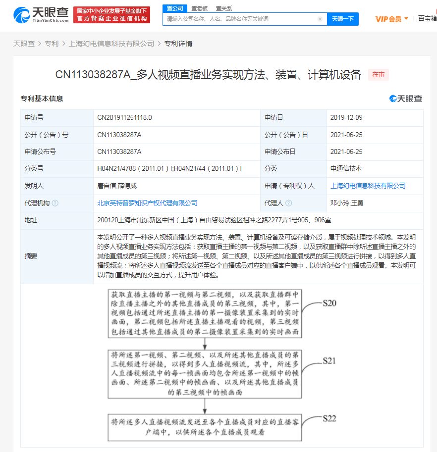 据天眼查APP显示,6月25日,上海幻电信息科技有限公司公开一项“多人视频直播业务实现方法、装置、计算机设备”专利,公开号CN113038287A,申请日期为2019年12月。