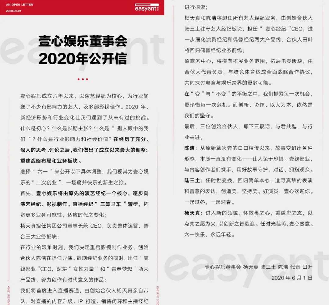 但很快,壹心娱乐董事会发表2020公开信,平息了壹心将面临大换血的传闻,公开信表示,公司将由原先的演艺经纪一个核心,逐步向演艺经纪、影视制作、直播经纪“三驾马车”转型。创始合伙人陈洁主导影视制作业务的重启,创始合伙人陆垚留守核心的艺人经纪业务板块,而杨天真出任集团董事长兼CEO,率队进入直播赛道。所以杨天真并不是如外界传闻所说,要“从壹心出走”,而是开始“在壹心开始自己的二次创业”。