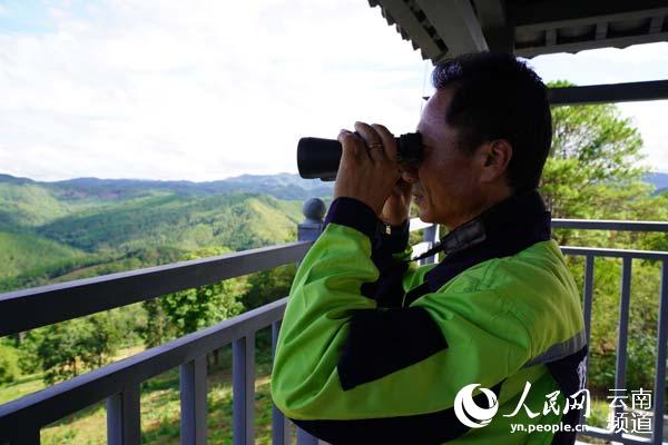 在普洱市思茅区六顺镇南邦河村勐主寨村民小组一处山顶,一座近10米高的监测塔很容易引人注意,杨忠平站在监测塔最高处,手持望远镜,换着角度眺望远方。