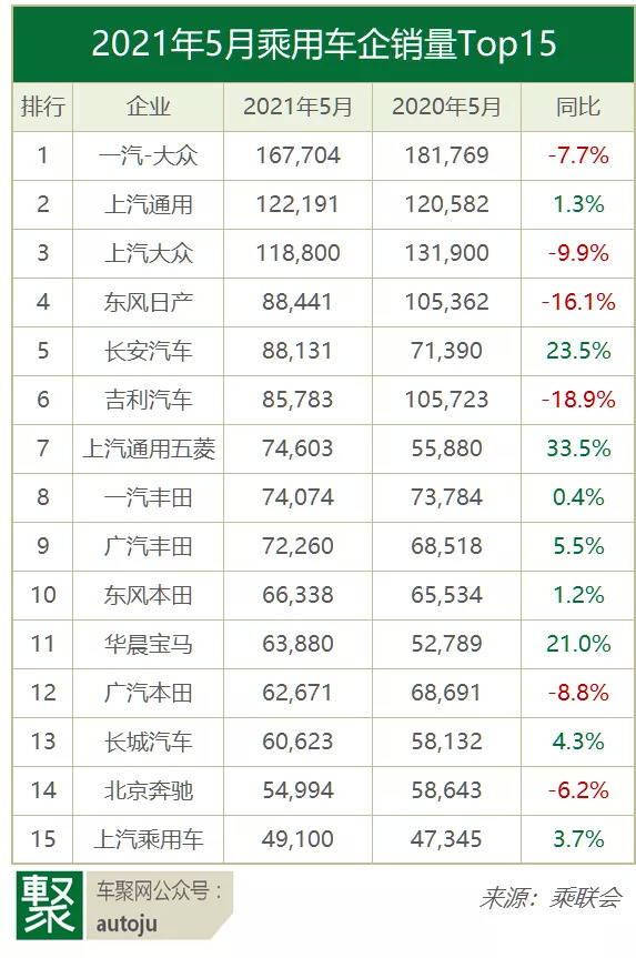5月乘用车企前三甲依旧是:一汽-大众、上汽通用和上汽大众。