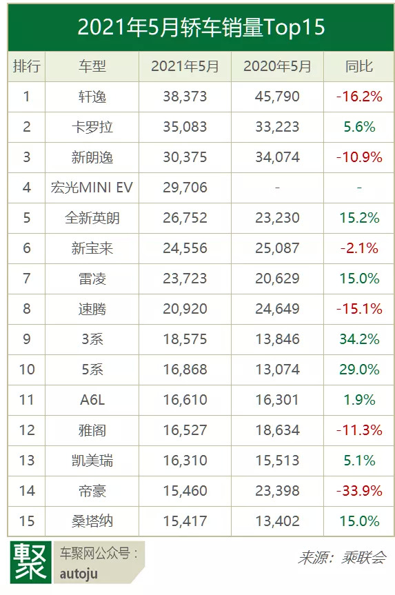 曾经常驻前10的吉利帝豪,5月销售同比下滑33.9%至15,460辆,无缘前10排在14位。不过,这或许是它的新款尚未推出消费者持币等待的缘故,若新车推出帝豪则前十可期。