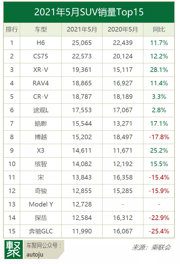 此外,值得一提的是,特斯拉Model Y销量持续攀升,5月以12,728辆销量跻身SUV市场第13位,成为新的变数。不过,Model Y的增长主要来自之前积压订单的释放,至于新增订单是否受维权的影响尚待观察。