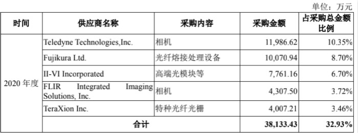 凌云光招股书数据显示,其生产所需原材料主要包括光纤器件和成像器件两大类,2020年这两类器件采购费用占比分别为37.25%和35.63%。