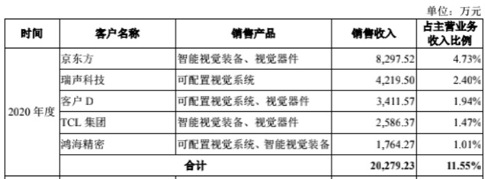 2020年凌云光前五大客户分别为京东方、客户G、中国信息通信科技集团、新亚制程和客户D。京东方系凌云光报告期内的老客户,但报告期内营收占比分别为1.98%、6.00%和4.73%,比例较低。
