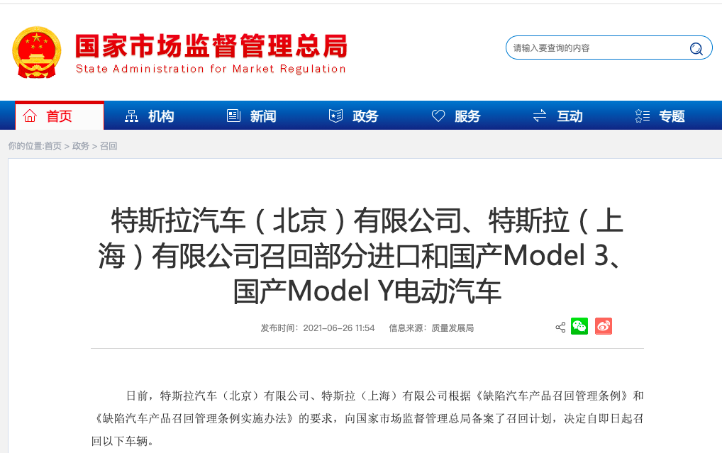 6月26日,国家市场监督管理总局在官方网站发布公告,特斯拉将召回部分进口和国产Model 3、国产Model Y。