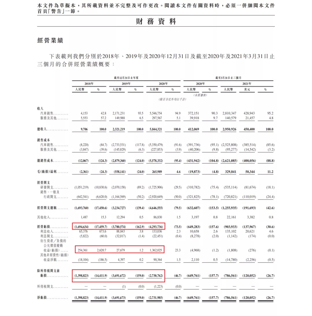 此番IPO申请书的相应数据显示,2018年-2020年,小鹏汽车实现营收分别为970万元、23.21亿元和58.44亿元,出现的亏损分别为13.99亿元、36.92亿元和27.32亿。而2021年一季度,小鹏汽车营收29.51亿元,亏损7.87亿元。