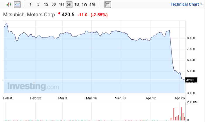 自上周承认操纵至少62.5万辆汽车的油耗测试数据后,三菱汽车的股价已经近乎腰斩,市值已经蒸发了大约40亿美元。