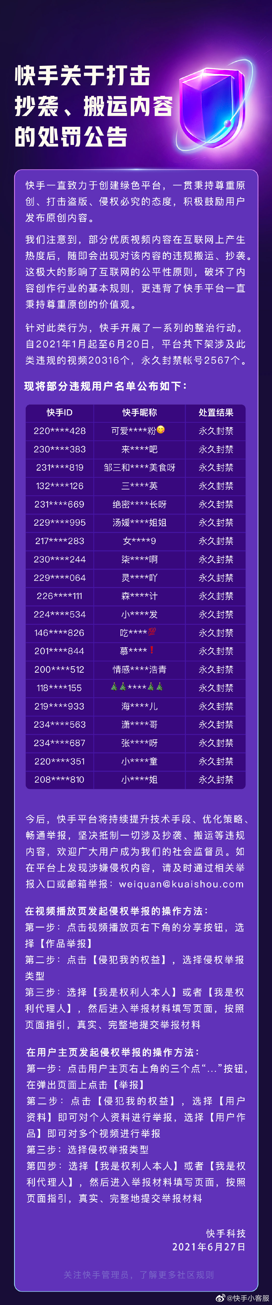 据@快手小客服 微博6月27日消息,快手发布关于打击抄袭、搬运内容的处罚公告,称自2021年1月起至6月20日,平台共下架涉及此类违规的视频20316个,永久封禁账号2567个。