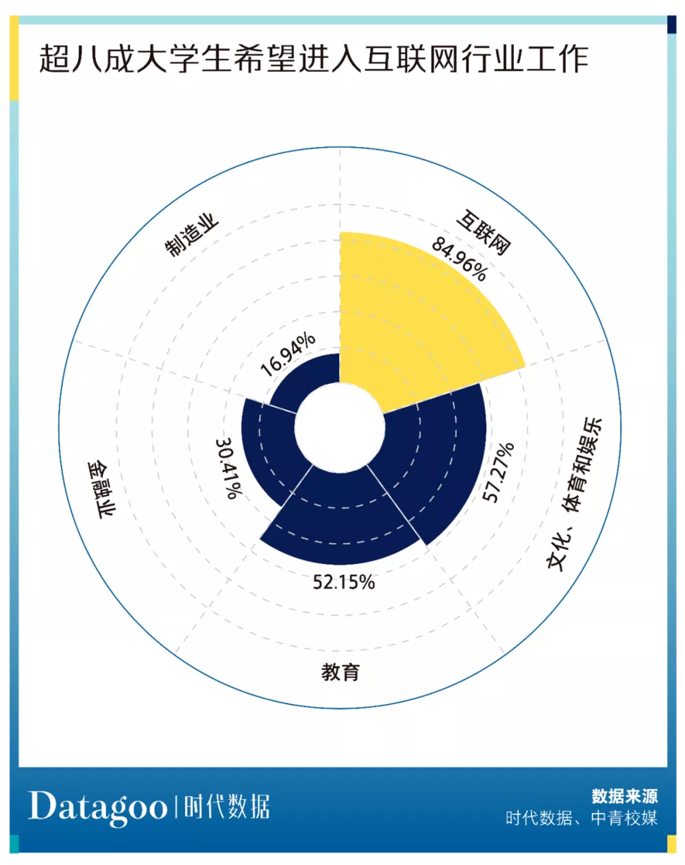 事实上,在加班盛行、工作压力大等行业特色人尽皆知的今天,互联网依然是待就业劳动者最希望进入的领域,今年3月中青校媒调研数据发现,超8成大学生希望毕业后进入互联网行业工作。