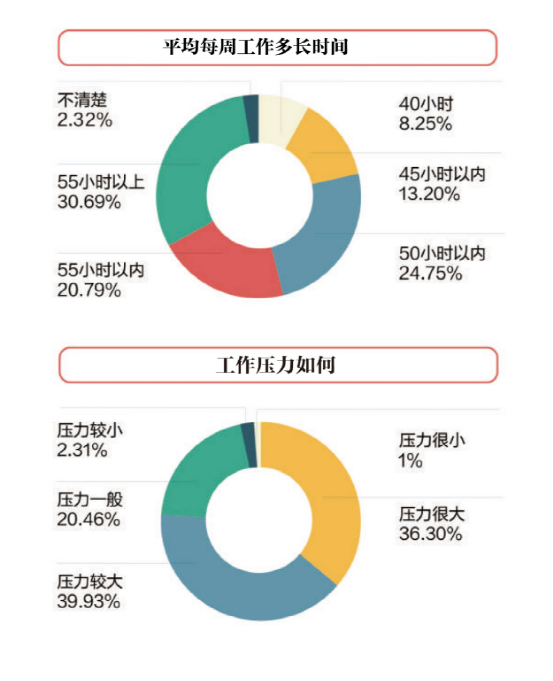 根据新京智库的调查数据显示,有76.15%的互联网从业受访者表示他们每周工作时间超过45小时以上(我国《劳动法》规定,平均每周工作时间不超过44小时),有74.43%非互联网从业受访者认为互联网人员每周工作时间超过45小时。
