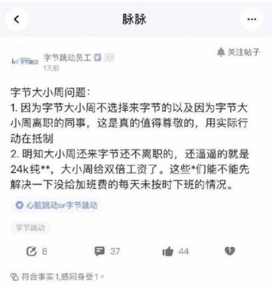 答案也很简单,同样以字节为例,反对取消大小周的员工给出了很直观的两个理由:其一,字节按周末双倍工资付足了大小周加班费(快手也是如此),取消大小周意味着每年要少赚22天X2的工资,对于一些重要部门或重要岗位的高薪员工来说,这笔钱可能超过10万块。