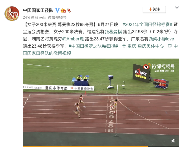 @中国国家田径队 微博消息,6月27日晚,2021年全国田径锦标赛暨全运会资格赛,女子200米决赛,福建名将葛曼棋跑出22.98秒(-0.2米/秒)夺冠,湖南名将黄瑰芬跑出23.47秒获得亚军,广东名将梁小静跑出23.48秒获得季军。
