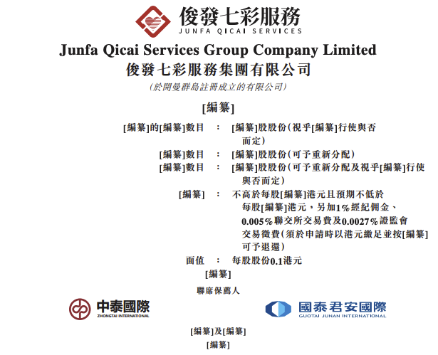 港交所官网显示,6月27日晚,俊发七彩服务集团有限公司向港交所提交上市申请,中泰国际、国泰君安国际为其联席保荐人。