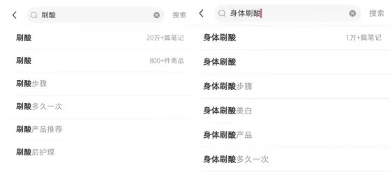 从数据层面分析,截止至2021年6月23日,在小红书上以“刷酸”为关键词搜索,共显示20万+篇笔记,以“身体刷酸”为关键词搜索显示1万+篇笔记。同时,“身体刷酸步骤”、“身体刷酸产品”等相关延伸关键词诸多,身体刷酸需求极具市场爆发力。