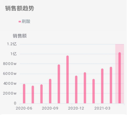据美业颜究院数据显示,统计线上市场规模,2020年6月-2021年5月刷酸市场规模近7.5亿元,月均销售增长率约为13%,2021年Q1销售额同比增长达到104%,刷酸护肤销售趋势一路走高,发展迅猛。