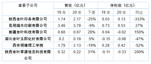 经营业绩欠佳的背后,陕西金叶多个业务板块的重要子公司业绩亏损,亏损比例近半。