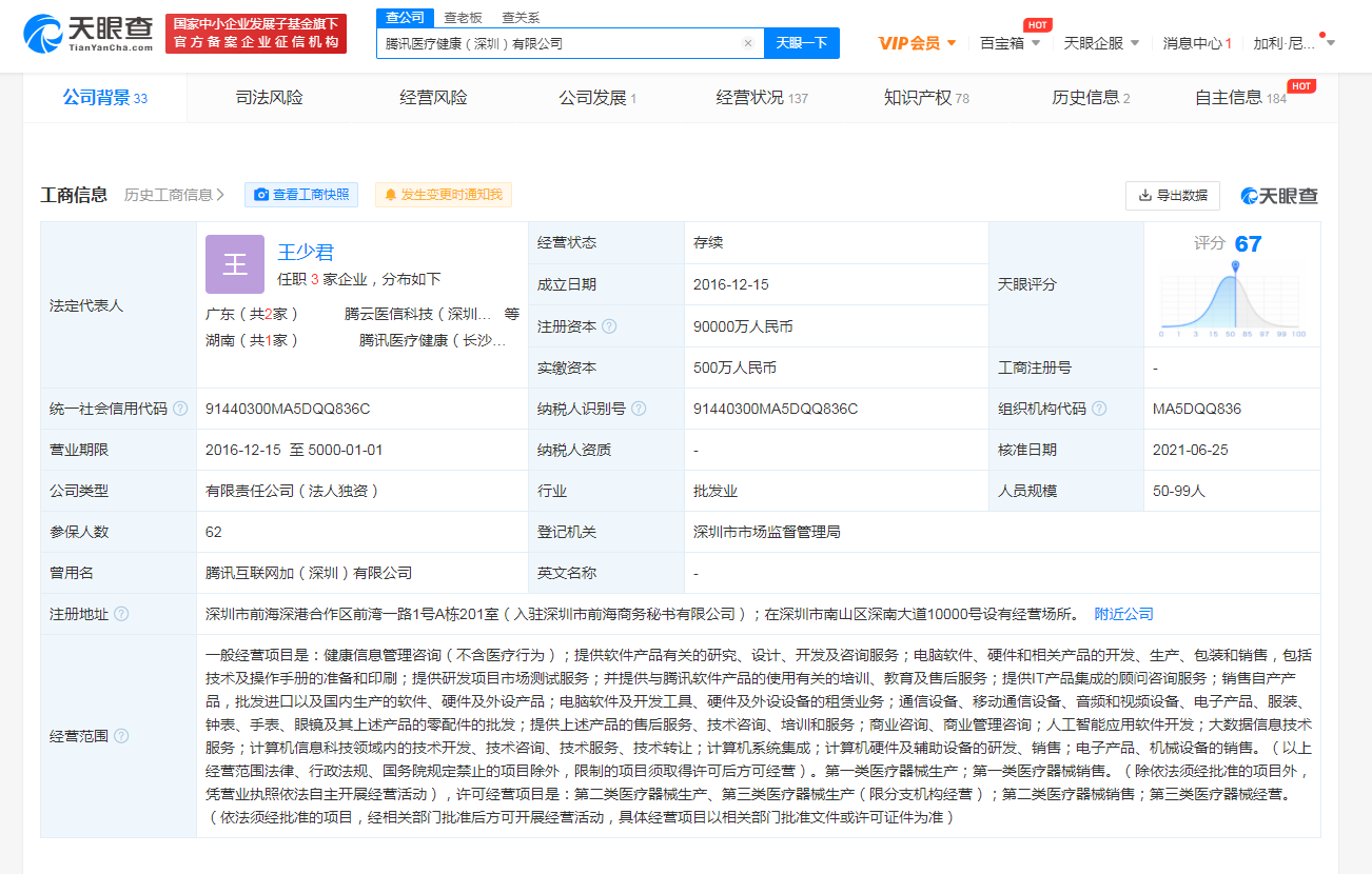 据天眼查APP显示,近日,腾讯医疗健康(深圳)有限公司发生工商变更,法定代表人由陈广域变更为王少君,同时公司注册资本由500万人民币增至9亿人民币,增幅17900%。腾讯医疗健康(深圳)有限公司成立于2016年12月,经营范围包括健康信息管理咨询;第二类医疗器械销售;第三类医疗器械经营等。股东信息显示,该公司由深圳市腾讯计算机系统有限公司全资持股。