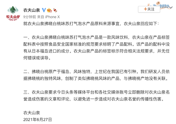 引发争议后,农夫山泉在6月27日回应称,拂晓白桃味苏打气泡水产品是一款风味饮料,农夫山泉在产品标签配料表中按照食品安全国家标准的规范要求标明了产品配料。该产品的配料中没有从日本福岛进口的成分。农夫山泉产品的标签标示符合相关法规要求,并无任何错误或误导。